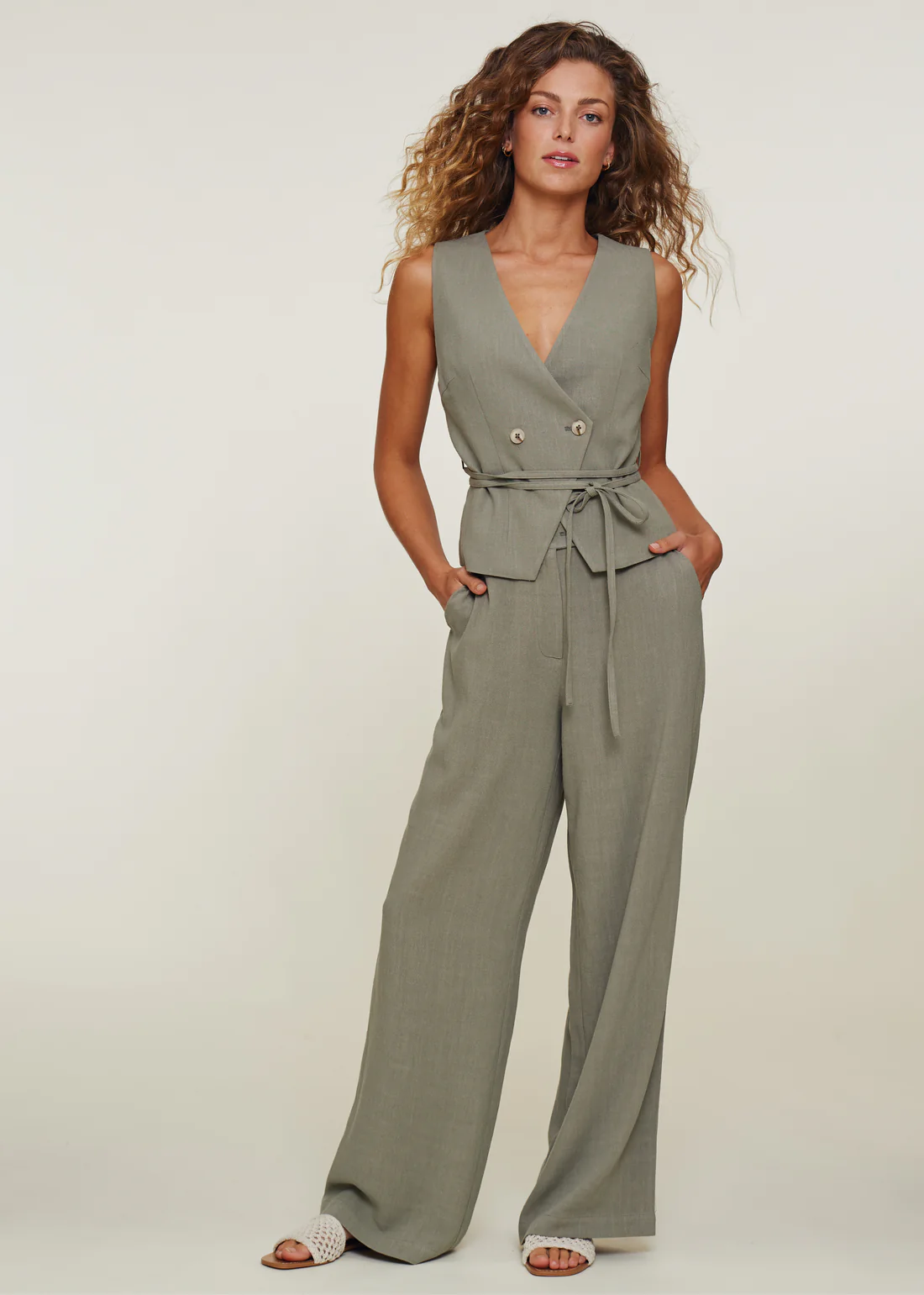 - Wijde pijpen en hoge taille zorgen voor een flatterende silhouet.