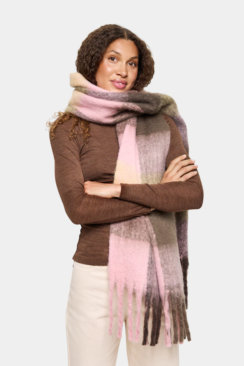 - Zachte sjaal met groot ruitpatroon in roze, bruin, beige en olijfgroen.