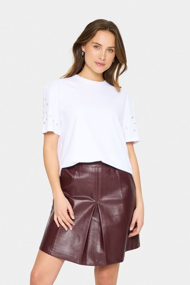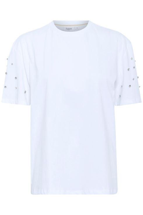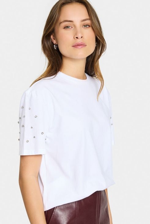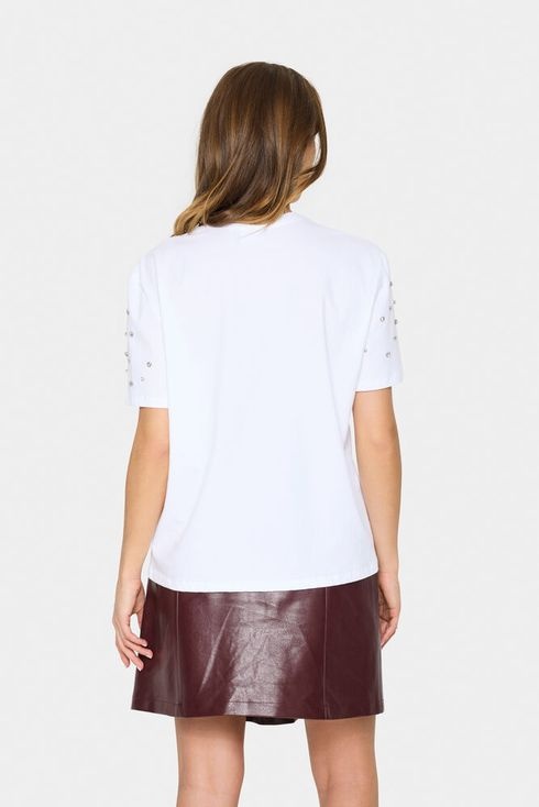 ProductomschrijvingWitte T-shirt met een twist aan de mouwen Steentje aan de mouwen en een iets dikker stof van T-shirt Door de dikkere stof valt de T-shirt mooi naar beneden. Stofsamenstelling: 100% katoen