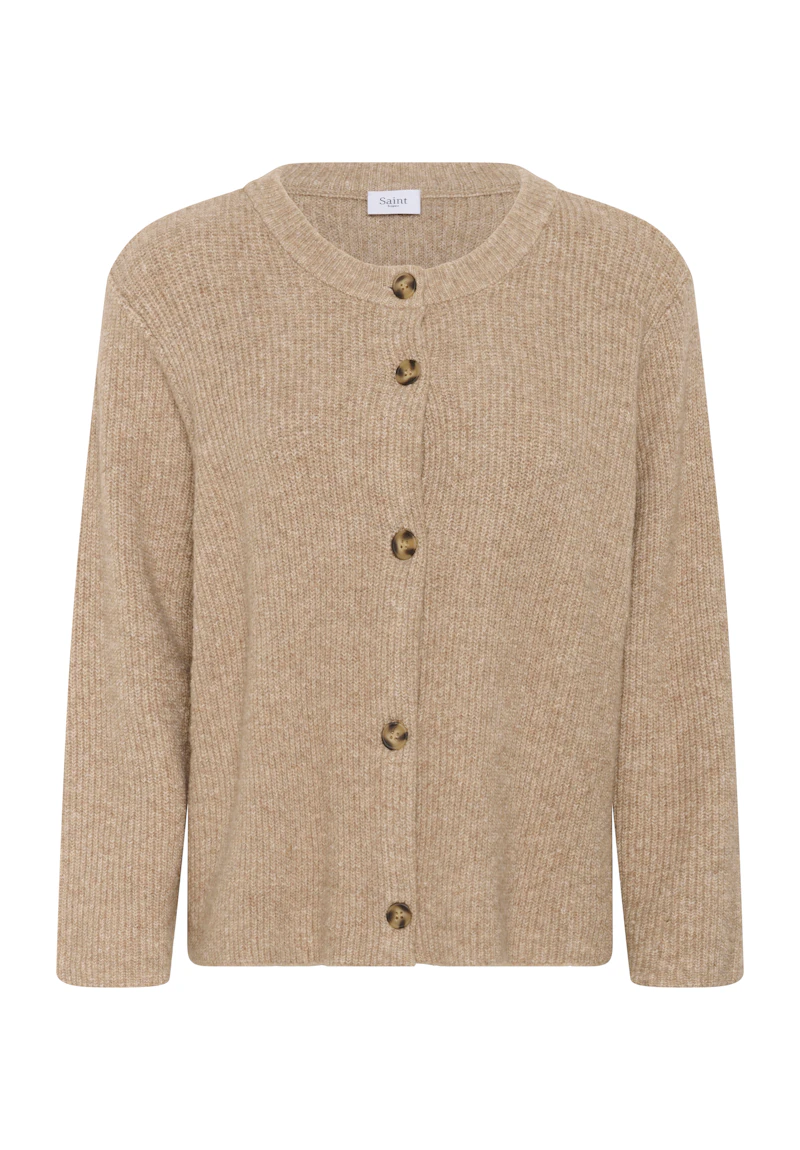 - Beige gebreid vest met ronde hals en lange mouwen.