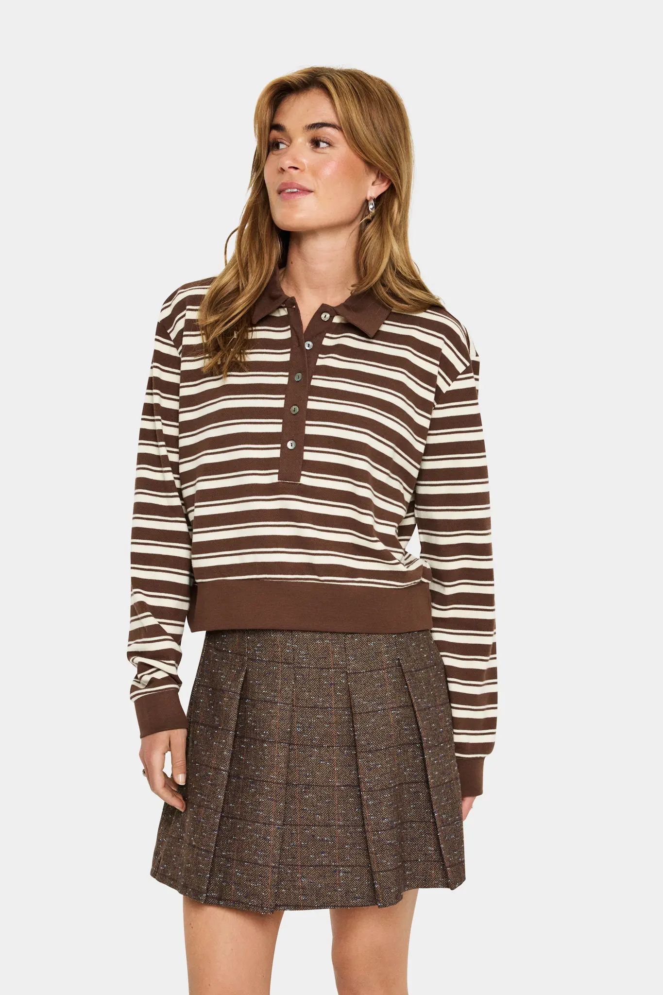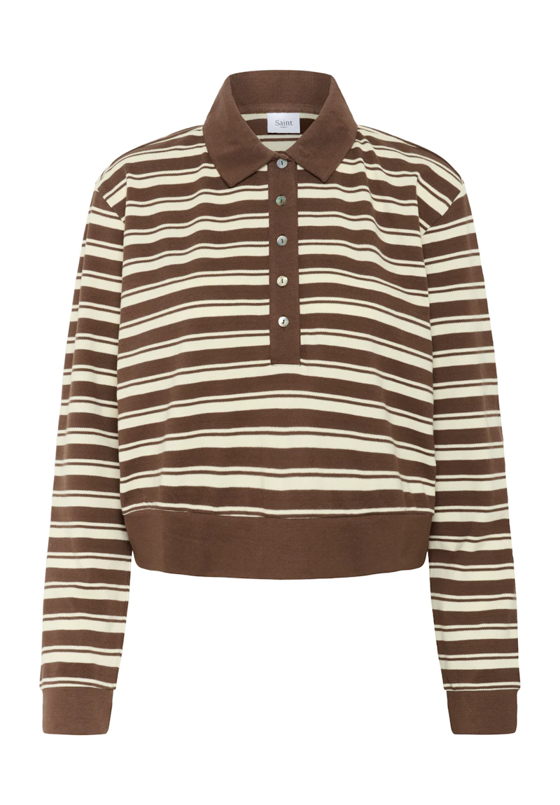 ProductomschrijvingBruin-beige gestreepte top met polokraag en knoopsluiting.Lange mouwen, geribde boorden en een cropped, relaxte pasvorm in zachte jersey.Het model is 172 cm lang en draagt maat S.Stofsamenstelling: 100% katoen