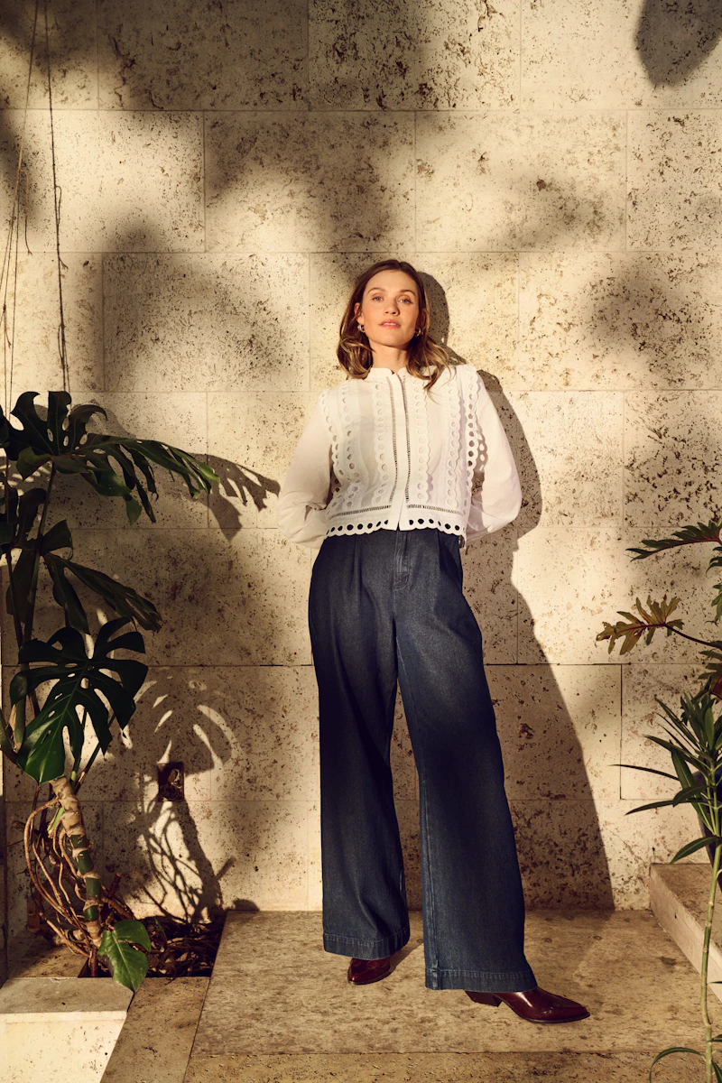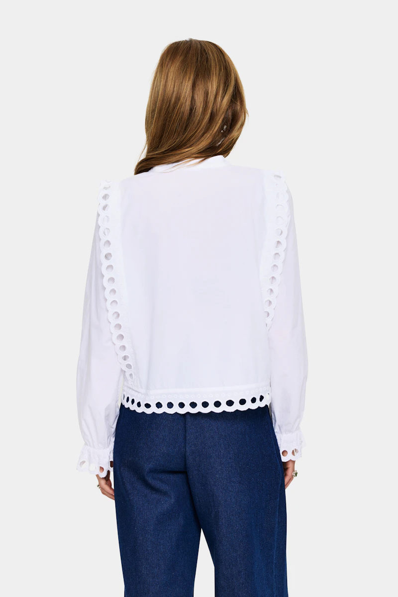 - Witte blouse met opengewerkte borduursels en decoratieve afwerking langs de voorkant en zomen.