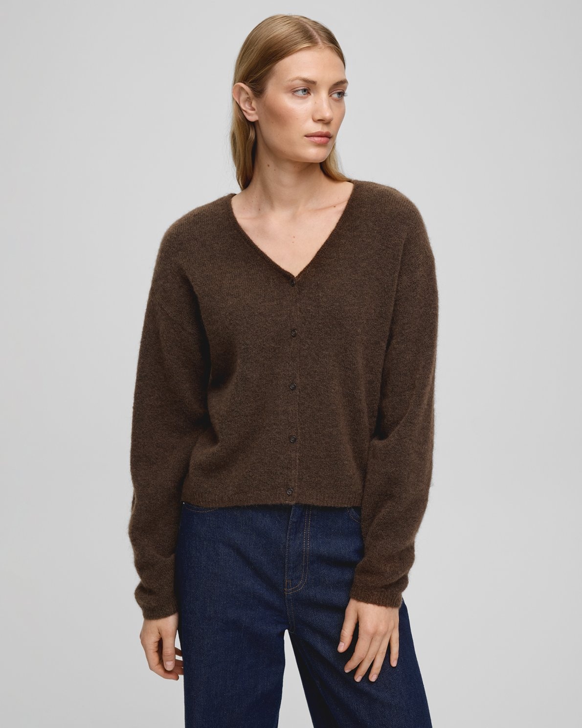 - De cardigan heeft verlaagde schouders, wat zorgt voor een losse en oversized uitstraling.