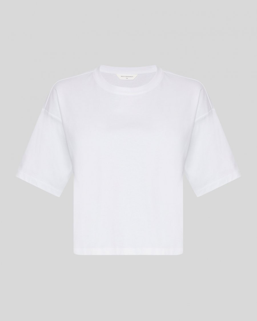 - Boxy pasvorm, klassieke ronde hals en iets langere mouwen met verlaagde schoudernaden.