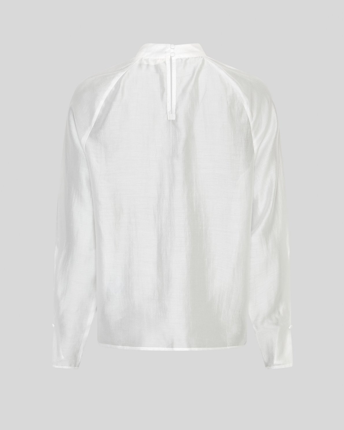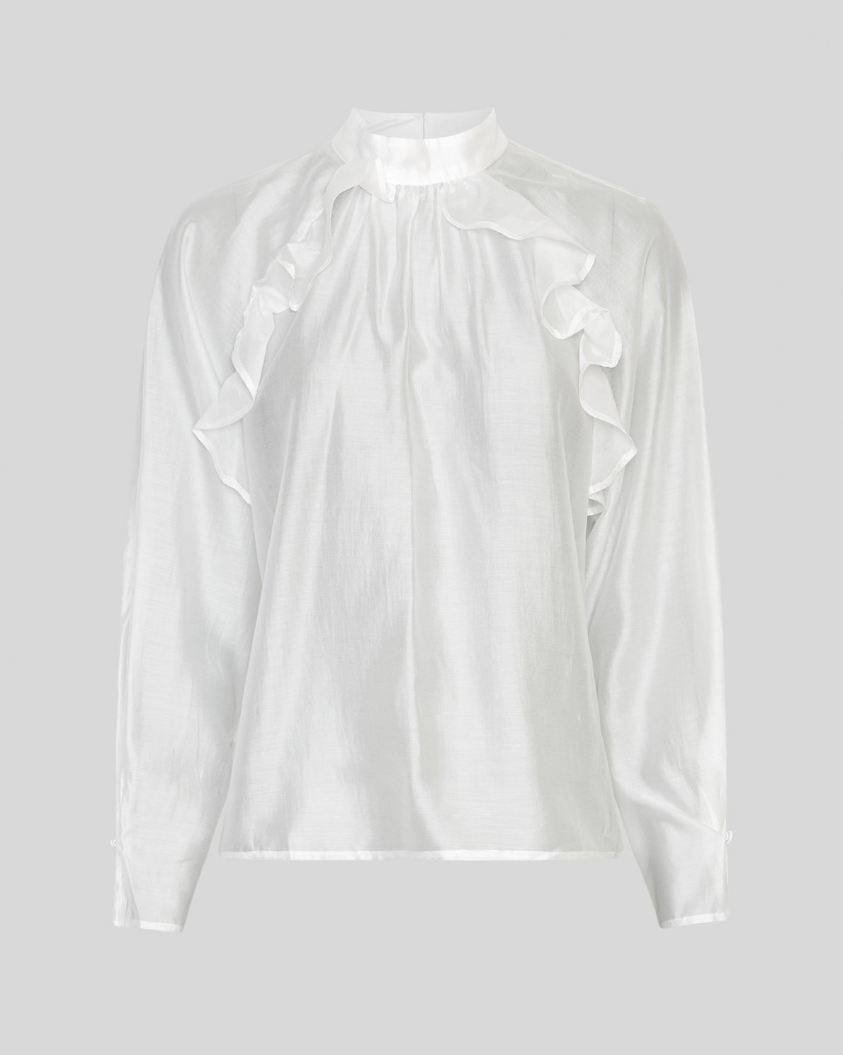 - De blouse heeft een gegolfde (frill) detail rond de schouders en een kleine knoopsluiting bij de pols.