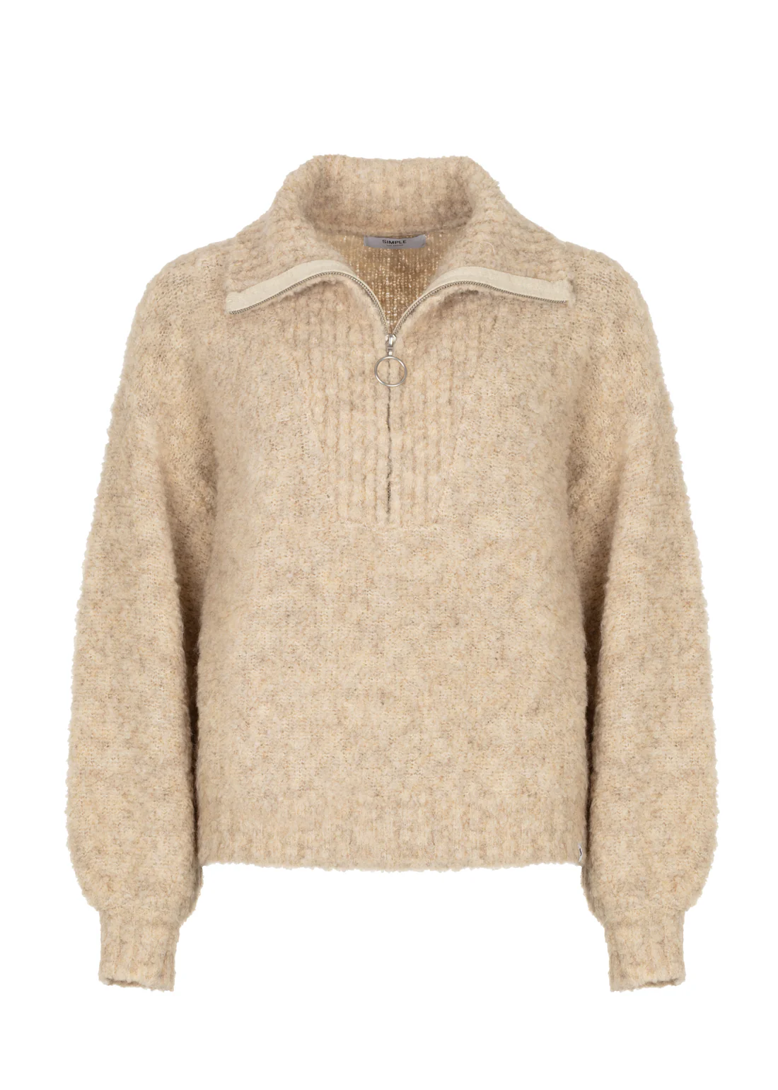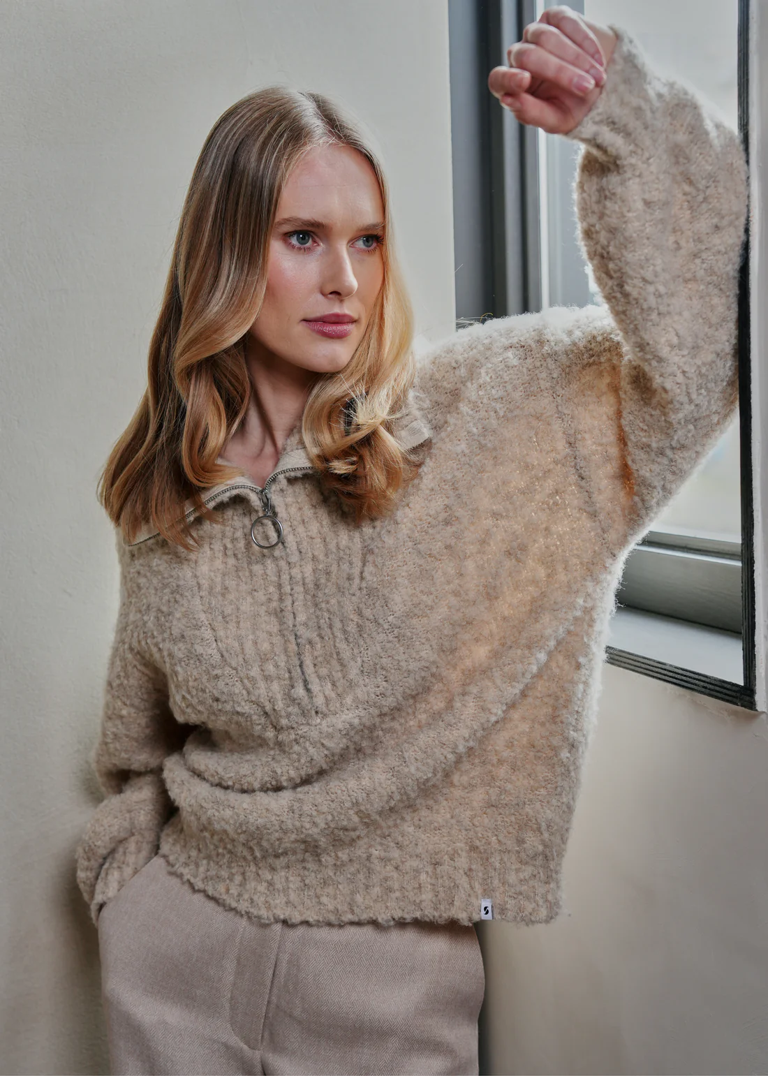 - De zachte, bouclé-achtige textuur voelt knus aan, terwijl de ritssluiting met opstaande kraag veelzijdigheid biedt in styling.